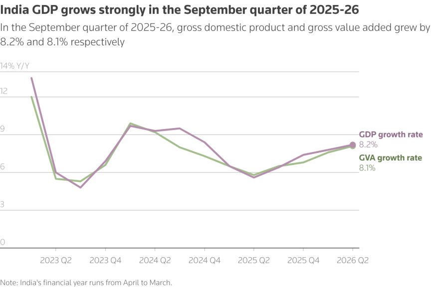 Strong growth in the world's fifth largest economy could boost Prime Minister Narendra Modi's standing domestically and give him room to negotiate a trade deal with the U.S. after Washington imposed tariffs of up to 50% on Indian goods imports, hurting sectors such as textiles, gems and jewellery, and food items.